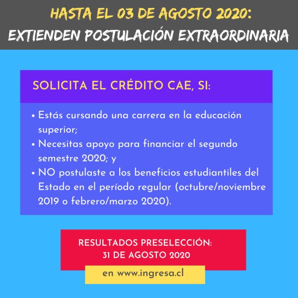 Ponemos en vuestro conocimiento la nueva extensión de plazo, para postular al CAE 2020, que ha informado la Comisión Ingresa. Según indica el sitio web https://postulacion.beneficiosestudiantiles.cl/fuas/ "La postulación extraordinaria al Crédito con Garantía Estatal para Estudios Superiores (Crédito CAE) Año 2020 estará disponible hasta el lunes 3 de agosto 2020, a las 14:00 horas. Los resultados de los postulantes preseleccionados se publicarán, en www.ingresa.cl, el lunes 31 de agosto 2020".